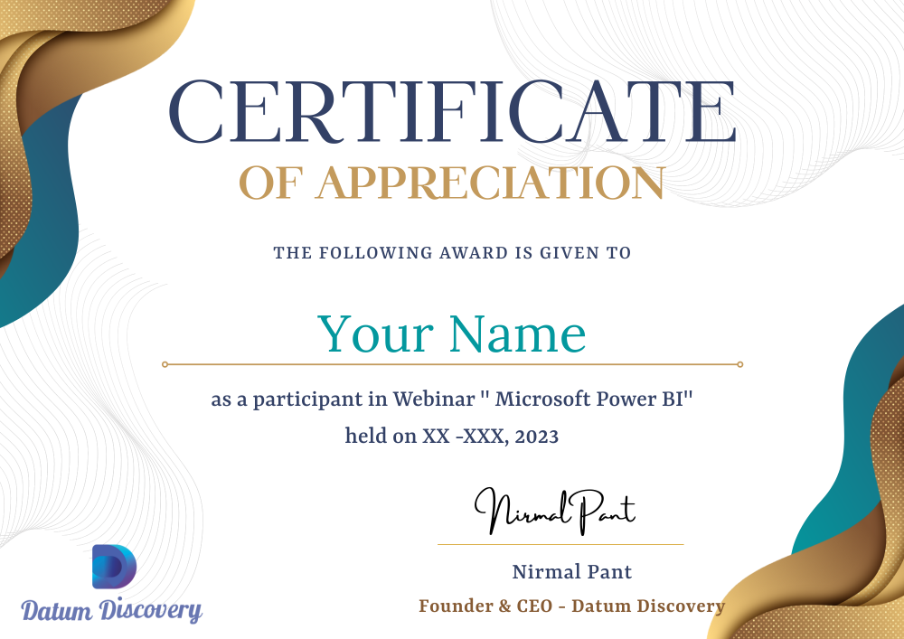 "I recently attended an informative webinar on Power BI and learned a lot about how it can be used to analyze data and create stunning visualizations. Nirmal Pant sir demonstrated various features and functionalities of Power BI and how it can help businesses make data-driven decisions. I particularly liked how easy it is to integrate Power BI with other Microsoft tools such as Excel and Teams. Looking forward to implementing what I learned to streamline my work and enhance decision-making. Thank you Nirmal Pant and Datum Discovery for putting together such a great webinar!"